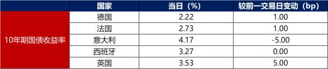1月9日,主要欧洲经济体10年期国债收益率走势分化。其中,德国10年期国债收益率上行1bp至2.22%;法国、英国10年期国债收益率分别上行1bp、5bp,意大利10年期国债收益率下行5bp,西班牙10年期国债收益率维持不变。