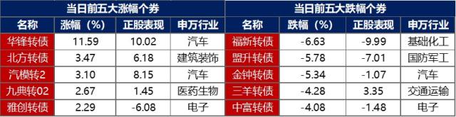 【转债市场主要指数小幅收跌】 12月18日,转债市场受权益市场影响弱势下探,当日中证转债、上证转债、深证转债分别收跌0.44%、0.37%、0.57%。当日,转债市场成交额343.27亿元,较前一交易日减少7.96亿元。转债市场个券多数下跌,550只个券中,72只上涨,471只下跌,7只持平。当日,华锋转债涨超11%,北方转债、汽模转2涨超3%,九典转02、雅创转债、欧晶转债、百洋转债涨超2%;下跌个券中,福新转债跌逾6%,盟升转债、金钟转债跌逾5%,三羊转债、中富转债跌逾4%。