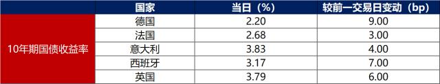 1月5日,受欧元区12月CPI通胀超预期上涨推动,主要欧洲经济体10年期国债收益率普遍上行。其中,德国10年期国债收益率上行9bp至2.20%,法国、意大利、西班牙、英国10年期国债收益率分别上行3bp、4bp、7bp和bp。
