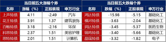 【转债市场主要指数小幅收跌】 1月5日,转债市场跟随权益市场继续走弱,当日中证转债、上证转债、深证转债分别收跌0.23%、0.04%、0.56%。当日,转债市场成交额425.10亿元,较前一交易日缩放量32.90亿元。转债市场多数个券下跌,552只个券中,89只上涨,449只下跌,14只持平。当日,上声转债涨超4%,花王转债、百畅转债涨超3%,科思转债、思特转债涨超2%;下跌个券中,鸿达转债跌逾15%,横河转债、润达转债、锦鸡转债、晶瑞转债、冠宇转债跌逾3%。