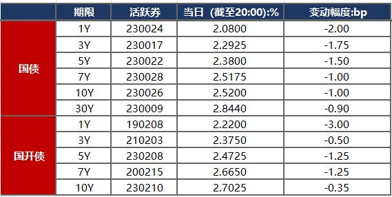 1月5日,股市偏弱,叠加资金面转松提振债市情绪,银行间主要利率债收益率普遍下行,中短券下行幅度更大。截至北京时间20:00,10年期国债活跃券230026收益率下行1.00bps至2.5200%;10年期国开债活跃券230210收益率下行0.35bps至2.7025%。