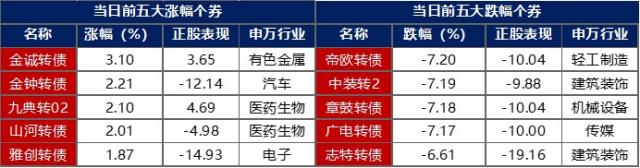 【转债市场主要指数小幅收跌】 2月5日,转债市场跟随权益市场震荡走弱,当日中证转债、上证转债、深证转债分别收跌0.88%、0.69%、1.24%。当日,转债市场成交额394.67亿元,较前一交易日放量18.60亿元。转债市场个券多数下跌,555只个券中,52只上涨,494只下跌,9只持平。当日,金诚转债涨超3%,金钟转债、九典转02、山河转债涨超2%;下跌个券中,帝欧转债、中装转2、章鼓转债、广电转债跌逾7%,志特转债、新致转债、冻时转债、华统转债跌逾6%。