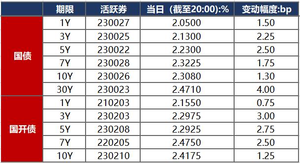 3月11日,周末无明显利空消息,早盘多头情绪较强,但随着股市走强,叠加1万亿超长期国债3月发行、以及部分机构或严控买入超长久期等传言,止盈盘涌现,债市转弱。当日银行间主要利率债收益率普遍上行,超长端上行幅度更大。截至北京时间20:00,10年期国债活跃券230026收益率上行1.30bps至2.3080%;10年期国开债活跃券230210收益率上行1.25bps至2.4175%。