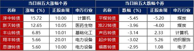 【转债市场主要指数小幅收涨】 3月11日,转债市场跟随权益市场继续走强,当日中证转债、上证转债、深证转债分别收涨0.39%、0.22%、0.68%。当日,转债市场成交额379.02亿元,较前一交易日放量18.11亿元。转债市场个券多数上涨,558只转债中,439只上涨,104只下跌,15只持平。当日,淳中转债涨超15%,新天转债涨超12%,表现亮眼,丰山转债涨超6%,翔丰转债、恩捷转债涨超5%;下跌个券中,平煤转债跌逾5%,准22转债、声讯转债、起步转债跌逾3%。