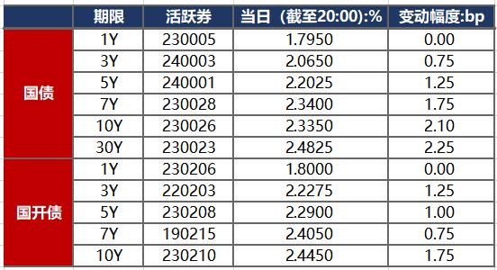 3月22日,早盘债市延续暖势,但人民币汇率走弱引发市场对货币宽松预期的担忧,叠加监管将限制公募基金银行间杠杆传闻,债市转而走弱。全天看,银行间主要利率债收益率多数上行。截至北京时间20:00,10年期国债活跃券230026收益率上行2.10bps至2.3350%;10年期国开债活跃券230210收益率上行1.75bps至2.4450%。