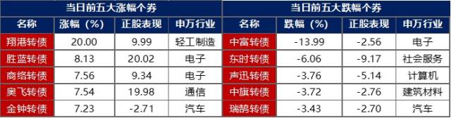 【转债市场主要指数小幅收跌】3月22日,转债市场跟随权益市场有所调整,当日中证转债、上证转债、深证转债分别收跌0.33%、0.27%、0.44%。当日转债市场成交额433.28亿元,较前一交易日放量17.17亿元。转债市场个券多数下跌,544支转债中,88支上涨,450支下跌,6支持平。当日,翔港转债继续涨停20%,胜蓝转债涨超8%,商络转债、奥飞转债、金钟转债涨7%,精达转债、盛路转债跌逾5%;下跌个券中,中富转债跌逾13%,东时转债跌逾6%,声讯转债、中旗转债、瑞鹄转债、华正转债跌逾3%。