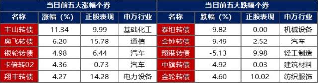 【转债市场主要指数集体收跌】 3月26日,转债市场有所补跌,当日中证转债、上证转债、深证转债分别收跌0.23%、0.19%、0.31%。当日,转债市场成交额556.82亿元,较前一交易日放量92.48亿元。转债市场个券多数下跌,544支转债中,161支上涨,378支下跌,5支持平。当日,上涨个券中,丰山转债涨超11%,奥飞转债涨超6%,银轮转债、卡倍转02、翔丰转债涨超4%;下跌个券中,泰坦转债、金钟转债跌逾9%,翔港转债跌逾5%,中旗转债、金轮转债跌逾4%。