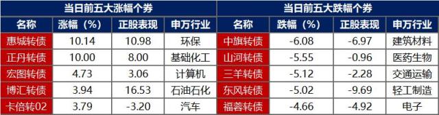 【转债市场主要指数小幅收跌】 4月19日,转债市场跟随权益市场缩量下行,当日中证转债、上证转债、深证转债分别收跌0.20%、0.16%、0.27%。当日,转债市场成交额502.02亿元,较前一交易日缩量73.09亿元。转债市场个券多数下跌,544支转债中,175支上涨,356支下跌,13支持平。当日,上涨个券中,惠城转债、正丹转债涨超10%,宏图转债涨超4%、博汇转债、卡倍转02、天壕转债、瑞丰转债涨超3%;下跌个券中,中旗转债跌逾6%,山河转债、三羊转债跌逾5%,东风转债跌逾5%。