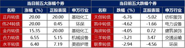 【转债市场主要指数小幅收涨】 5月6日,转债市场跟随权益市场表现强势,当日中证转债、上证转债、深证转债分别收涨0.88%、0.71%、1.19%。当日,转债市场成交额562.90亿元,较前一交易日放量76.91亿元。转债市场个券多数上涨,547支转债中,506支上涨,28支下跌,13支持平。当日,上涨个券中,正丹转债、伟24转债涨停20%,金丹转债涨超15%,表现亮眼;下跌个券中,天创转债跌逾6%,凯中转债、海波转债跌逾4%。