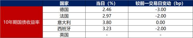 5月6日,主要欧洲经济体10年期国债收益率走势分化。其中,德国10年期国债收益率下行3bp至2.46%,法国、西班牙10年期国债收益率均下行2bp,意大利10年期国债收益率保持不变,英国因5月初银行假日休市一日。
