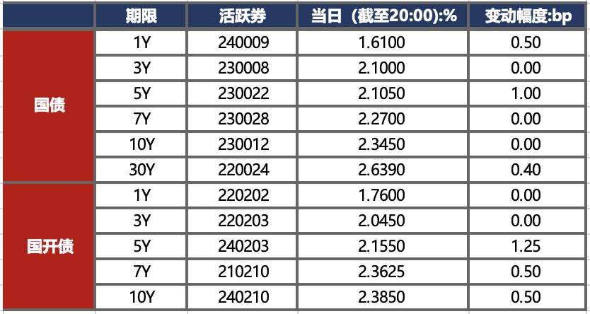 5月20日,早盘受地缘政治因素影响,避险情绪升温,债市延续暖势,但尾盘资金面偏紧推动债市回调。全天看,银行间主要利率债收益率窄幅震荡。截至北京时间20:00,10年期国债活跃券230012收益率持平于2.3450%;10年期国开债活跃券240210收益率上行0.50bps至2.3850%。