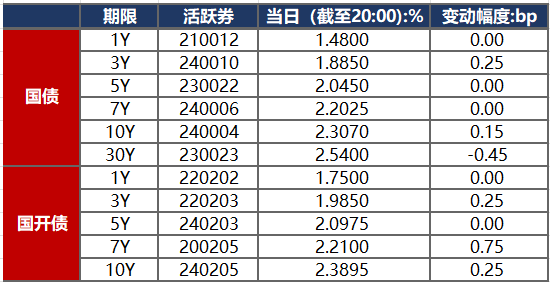 6月7日,5月出口数据超预期高增,小幅压制市场情绪,当日银行间主要利率债收益率继续窄幅震荡。截至北京时间20:00,10年期国债活跃券240004收益率上行0.15bp至2.3070%;10年期国开债活跃券240205收益率上行0.25bp至2.3895%。