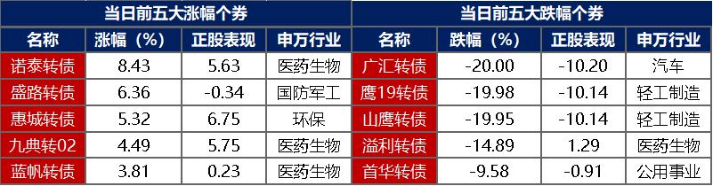 【转债市场主要指数集体收跌】 6月21日,转债市场跌幅超过权益市场,当日中证转债、上证转债、深证转债分别收跌0.58%、0.56%、0.62%。当日,转债市场成交额571.66亿元,较前一交易日缩量42.77亿元。转债市场个券多数下跌,536支转债中,140支上涨,386支下跌,10支持平。当日,上涨个券中,诺泰转债涨超8%,盛路转债涨超6%,惠城转债涨超5%,九典转02涨超4%;下跌个券中,广汇转债跌停20%,鹰19转债、山鹰转债跌逾19%,溢利转债跌逾14%。