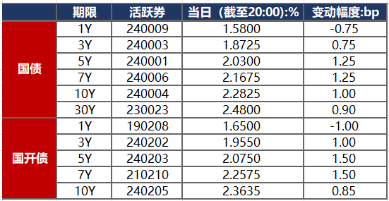 6月21日,银行间主要利率债收益率有所分化,中长端上行,短端下行。截至北京时间20:00,10年期国债活跃券240004收益率上行1.00bp至2.2825%;10年期国开债活跃券240205收益率上行0.85bp至2.3635%。