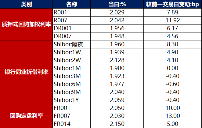 6月21日,税期走款之际,央行公开市场净投放进一步缩量,资金面整体偏紧,主要回购利率继续上行。当日DR001上行6.17bp至1.956%,DR007上行4.56bp至1.948%。
