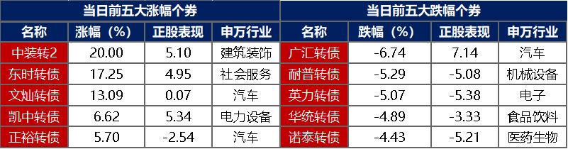 【转债市场主要指数跟随下跌】 7月3日,转债市场跟随权益市场有所走弱,当日中证转债、上证转债、深证转债分别收跌0.51%、0.41、0.70%。当日,转债市场成交额648.95亿元,较前一交易日放量79.85亿元。转债市场个券多数下跌,536支转债中,80支上涨,445支下跌,11支持平。当日,上涨个券中,中装转2涨停20%,东时转债涨超17%,文灿转债涨超13%;下跌个券中,广汇转债跌逾6%,耐普转债、英力转债跌逾5%。