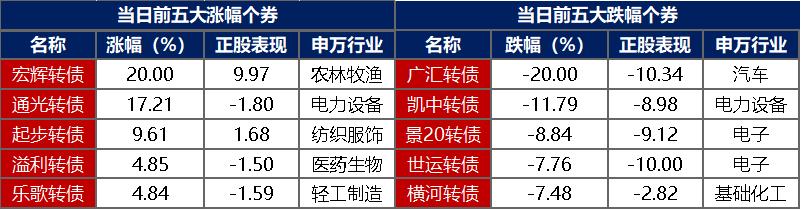 【转债市场主要指数小幅收跌】 7月17日,转债市场跟随权益市场继续走弱,当日中证转债、上证转债、深证转债分别收跌0.68%、0.65%、0.73%。当日,转债市场成交额628.74亿元,较前一交易日缩量20.49亿元。转债市场个券多数下跌,537支转债中,91支上涨,427支下跌,19支持平。当日,上涨个券中,宏辉转债涨停20%,通光转债涨超17%,起步转债涨超9%,表现亮眼;下跌个券中,广汇转债跌停20%,凯中转债跌逾11%,景20转债跌逾8%,调整幅度较大。