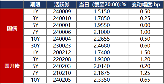 7月18日,市场仍受前一日监管调研中小银行债券持仓结构报导影响,加之对三中全会后的政策措施有所期待,债市小幅回调。截至北京时间20:00,10年期国债活跃券240004收益率上行0.50bp至2.2655%;10年期国开债活跃券240205收益率上行0.65bp至2.3350%。
