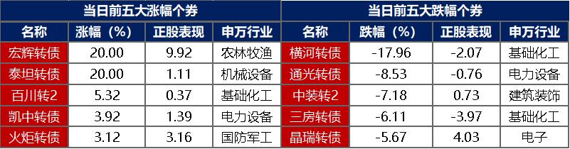 【转债市场主要指数小幅收跌】 7月18日,转债市场继续小幅下行,当日中证转债、上证转债、深证转债分别收跌0.08%、0.04%、0.15%。当日,转债市场成交额652.27亿元,较前一交易日放量25.53亿元。转债市场个券多数下跌,537支转债中,207支上涨,313支下跌,17支持平。当日,上涨个券中,宏辉转债、泰坦转债涨停20%,表现亮眼,百川转2涨超5%;下跌个券中,横河转债跌逾17%,通光转债跌逾8%,中装转2跌逾7%。