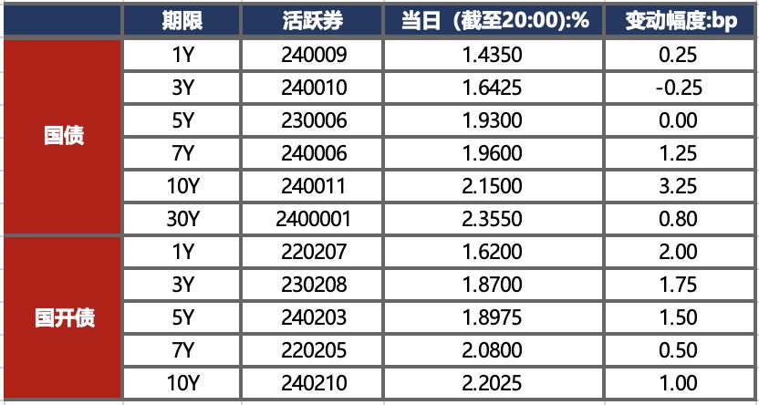 8月5日,海外市场动荡加剧,避险情绪飙升,带动债市继续走强,10年期国债收益率一度突破2.1%至2.08%左右。随后受央行指导大行卖债传闻以及止盈需求影响,债市大幅回调。截至北京时间20:00,10年期国债活跃券240011收益率上行3.25bp至2.1500%;10年期国开债活跃券240210收益率上行1.00bp至2.2025%。