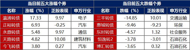 【转债市场主要指数跟随收跌】 8月14日,转债市场跟随权益市场继续下行,当日中证转债、上证转债、深证转债分别收跌0.37%、0.28%、0.52%。当日,转债市场成交额488.7亿元,较前一交易日放量108.4亿元。转债市场大多个券下跌,530支转债中,112支上涨,407支下跌,11支持平。当日,上涨个券中,瀛通转债涨超17%,正裕转债涨超6%,永鼎转债涨超5%;下跌个券中,三羊转债跌逾14%,惠城转债跌逾9%,东时转债跌逾4%。