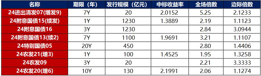 【财政部在香港顺利发行2024年第四期90亿元人民币国债】据财政部,8月14日,中华人民共和国财政部在香港特别行政区,面向机构投资者招标发行2024年第四期90亿元人民币国债,受到投资者广泛欢迎,认购倍数3.37倍。其中,2年期(增发)30亿元,发行价格100.39元,对应发行利率1.95%;3年期(增发)30亿元,发行价格100.70元,对应发行利率2.00%;10年期(增发)30亿元,发行价格100.60元,对应发行利率2.38%。