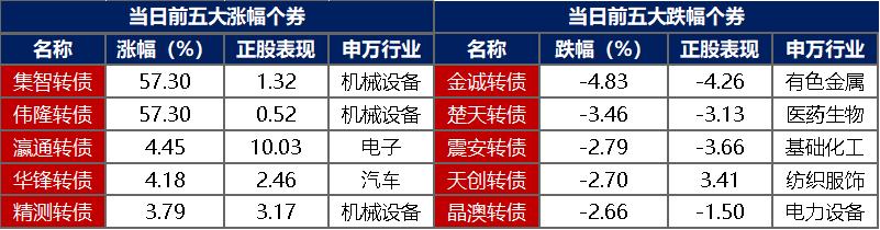 【转债市场主要指数涨跌不一】 8月28日,转债市场跟随权益市场窄幅震荡,当日中证转债、上证转债分别收跌0.04%、0.13%,深证转债收涨0.13%。当日,转债市场成交额334.37亿元,较前一交易日缩量83.7亿元。转债市场大多个券上涨,537支转债中,323支上涨,195支下跌,19支持平。当日,上涨个券中,新上市集智转债于伟隆转债涨停57.3%,领涨市场;下跌个券中,金诚转债跌逾4%,楚天转债跌逾3%。