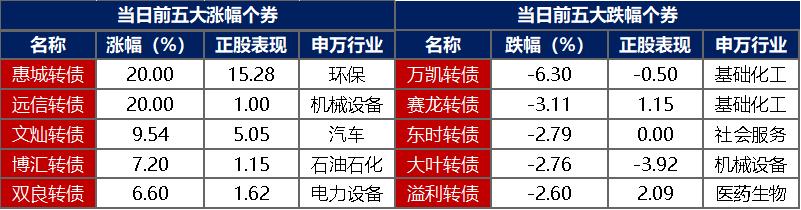 【转债市场主要指数跟随收涨】 9月5日,转债市场跟随权益市场继续走强,当日中证转债、上证转债、深证转债分别收涨0.63%、0.47%、0.93%。当日,转债市场成交额418.2亿元,较前一交易日放量51.08亿元。转债市场个券多数上涨,541支转债中,455支上涨,73支下跌,13支持平。当日,上涨个券中,远信转债继续涨停20%,惠城转债也涨停20%,文灿转债涨超9%,博汇转债涨超7%;下跌个券中,新上市万凯转债跌逾6%,领跌市场,存量个券中赛龙转债跌逾3%。